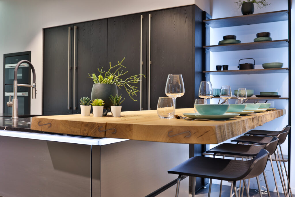 Are you looking for a contemporary kitchen design that embraces both form and function? Opt for open shelving from our Iconic collection. This sleek and bold option replaces traditional kitchen cabinets with a stylish shelving system that makes a statement. The unique mix of materials creates texture and visual interest, while discreet lighting below the shelves adds a subtle glow to the space.