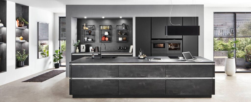 noblessa can help you get this industrial modern look in your kitchen with faux concrete.