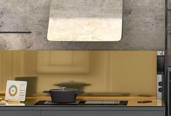 Esprit has the built-in technology and style one would expect from an ultra-modern, futuristic kitchen with its sleek lines, gold backsplash and appliances that make life simpler.