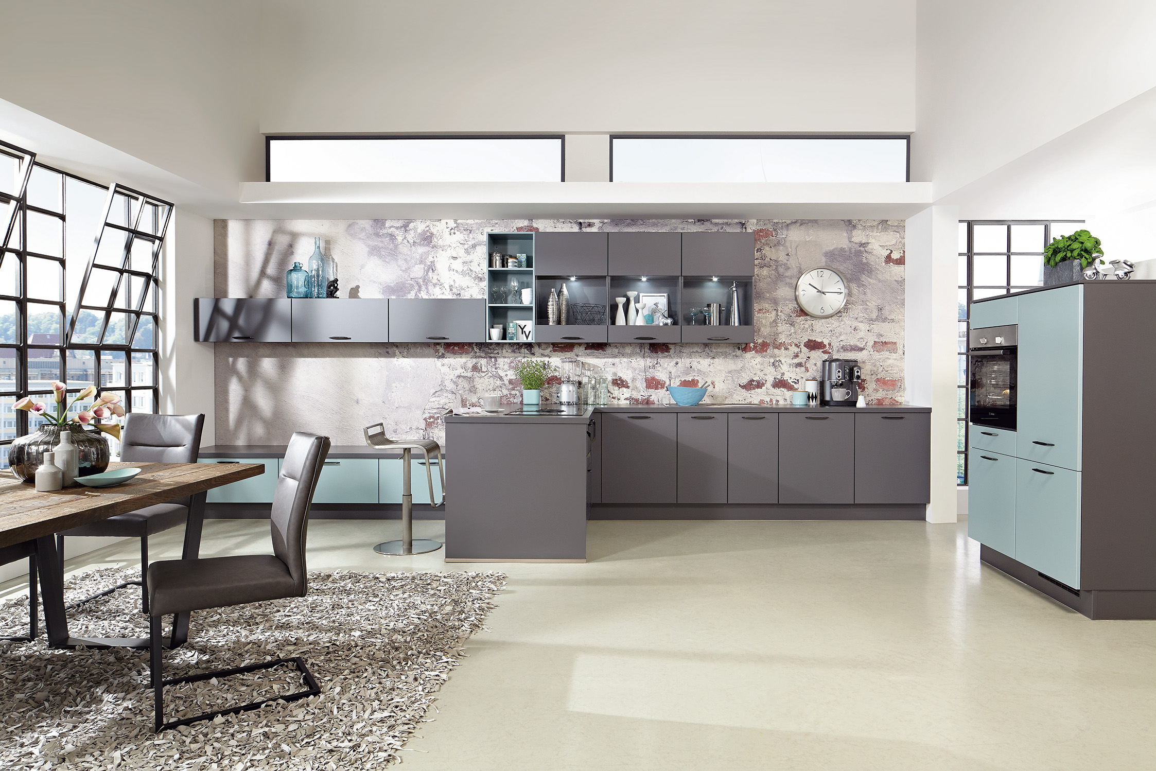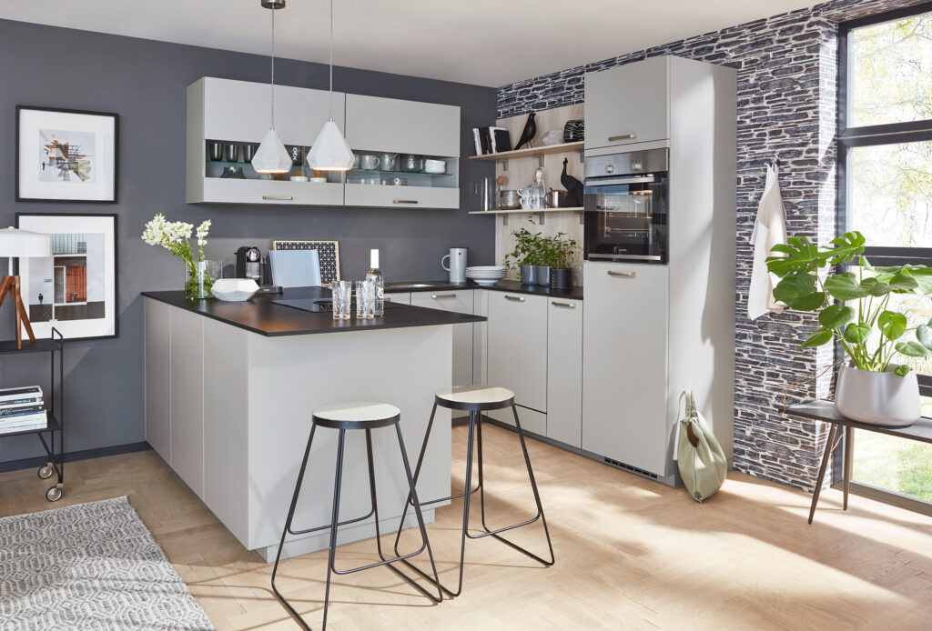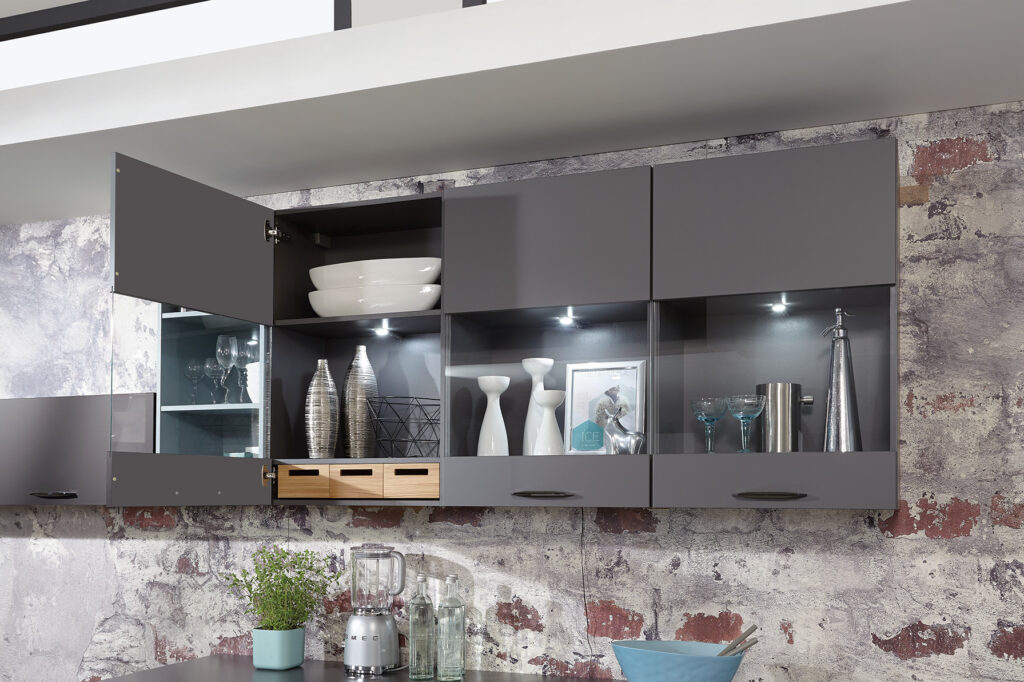 The Motion Collection is elegance and modernity combined. You can choose to make it a handleless design to play off its sleek, clean lines or include handles for added detail. The lacquered laminate cabinet fronts are available in silk grey, alpine white, savannah, aqua, slate grey and black – all ultra-matte for a completely modern finish. Window displays within the cabinets elegantly showcase some of your favorite items.