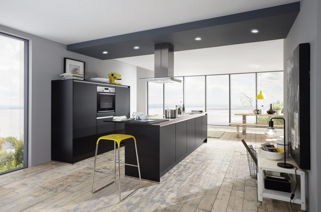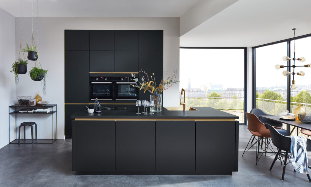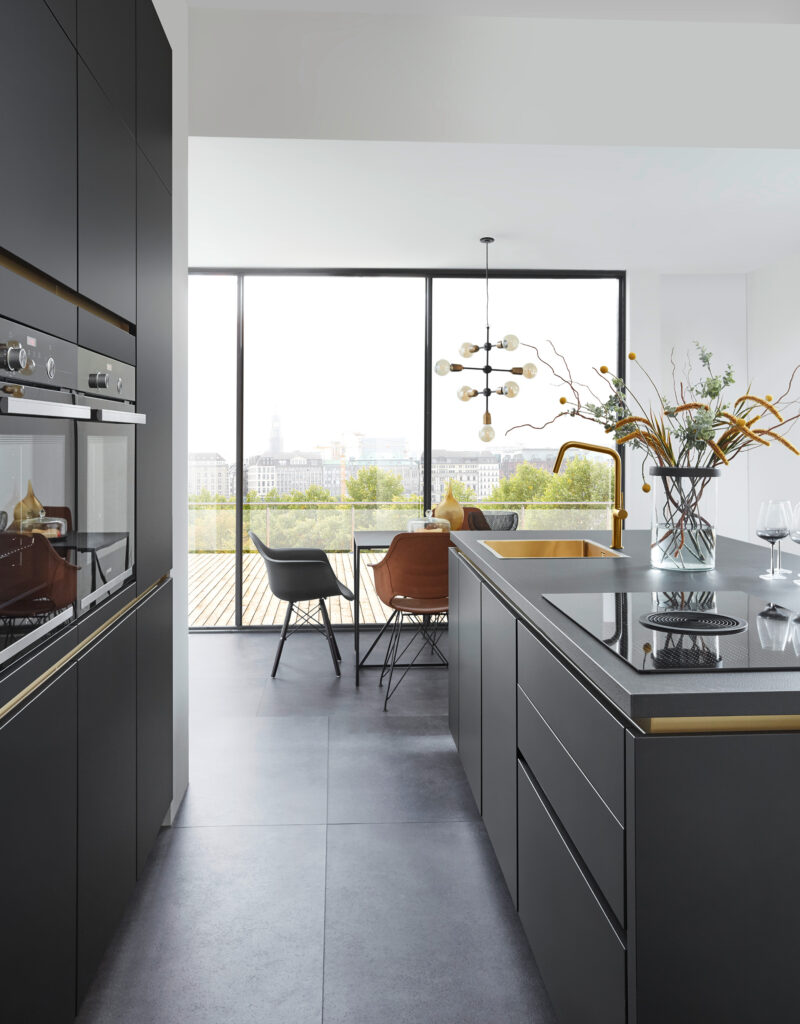 Our Line N handleless cabinets provide a sleek and modern appeal. When combined with golden elements such as the Line N recessed handles and brushed gold faucet tap, this sleek kitchen is elevated an even higher level of modern urban luxury.